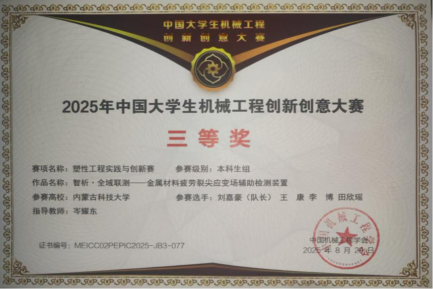 近日,由中国机械工程学会主办,中国机械工程学会塑性工程分会、太原科技大学和中国机械总院集团北京机电研究所有限公司承办的2025年中国大学生塑性工程创新创意大赛——“太平洋精锻杯” 第二届塑性工程实践与创意赛总决赛在太原科技大学举行。我院岑耀东副教授指导刘嘉豪、王康、李博、田欣瑶等学生申报的作品“智析·全域联测——金属材料疲劳裂尖应变场辅助检测装置”获得本科生组全国三等奖,这也是我院继2024年获得首届中国大学生塑性工程创新创意大赛以来,再次斩获佳绩。